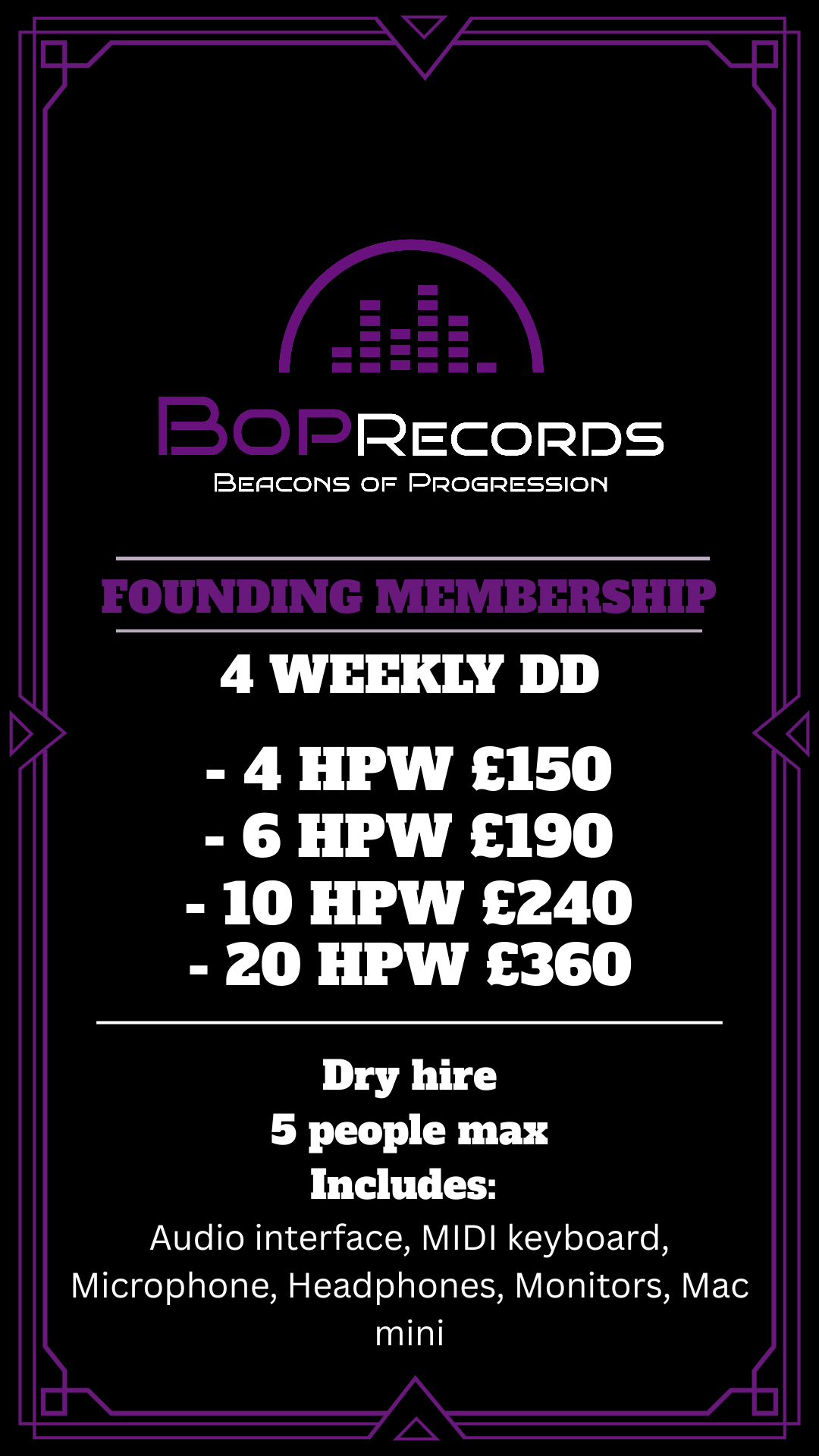 Dry hire studio access (max 5 people), audio interface, MIDI keyboard, microphone, headphones, monitors, Mac Mini.